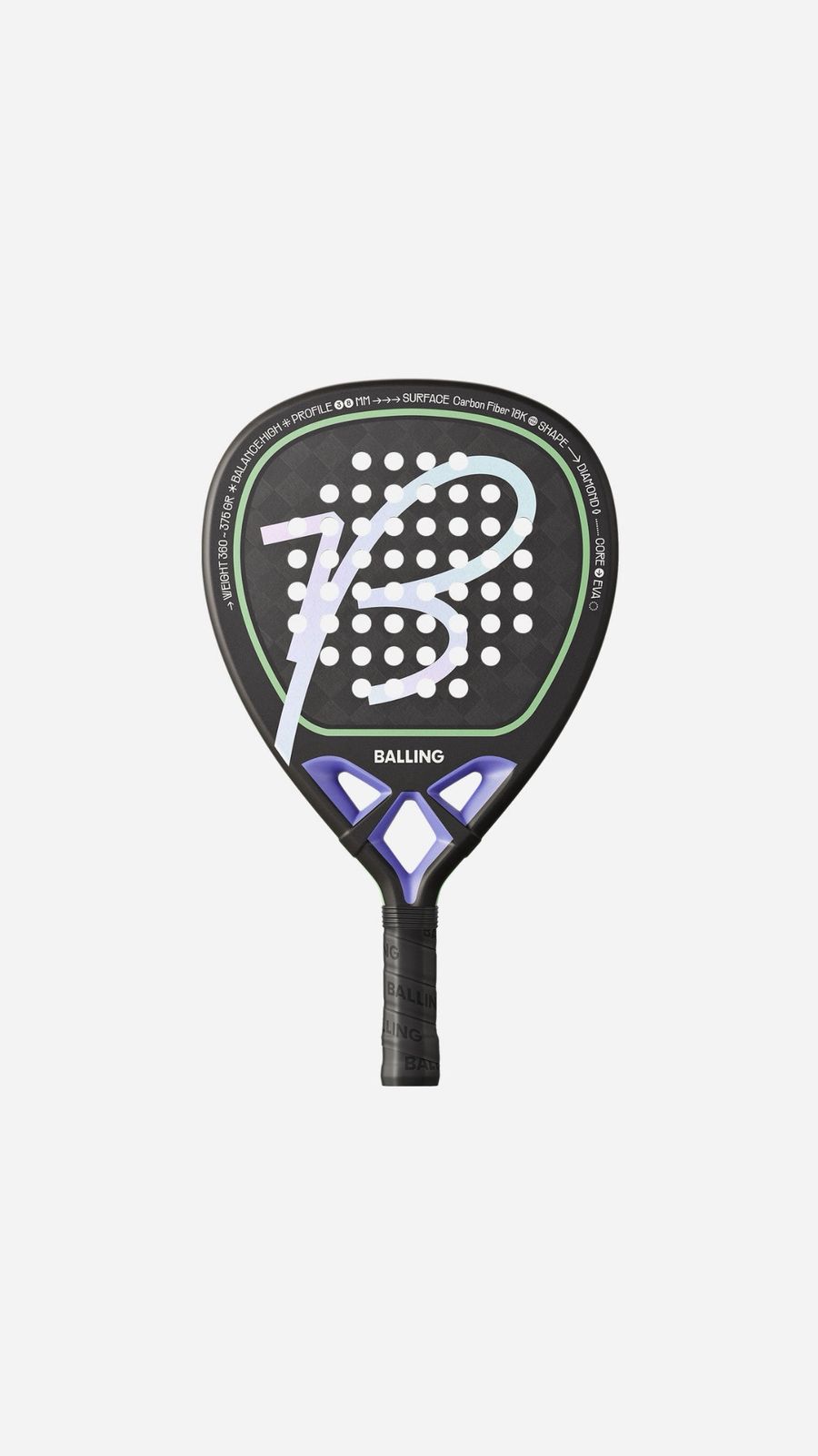 La pala Balling Mosaic Diamond 18K está diseñada para jugadores experimentados y competitivos con un estilo de juego ofensivo. La forma de diamante proporciona una distribución de peso hacia la cabeza de la raqueta, lo que garantiza una mayor potencia en cada golpe.